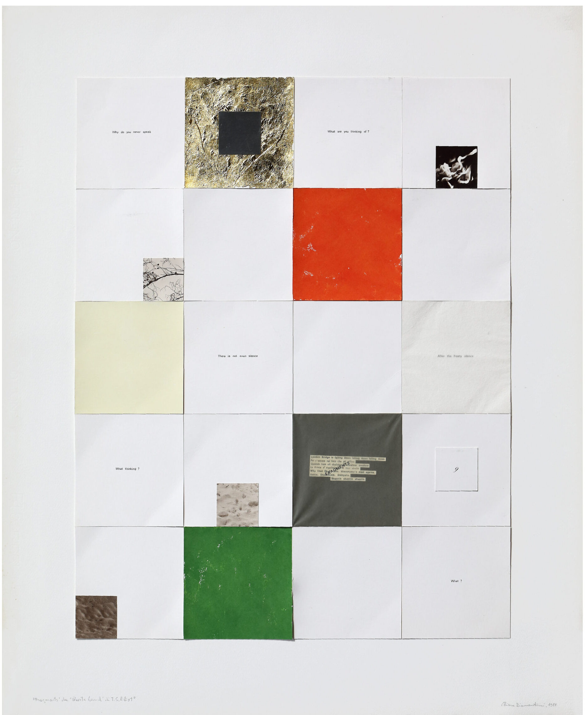 Spiega Bentivoglio nel catalogo: “Smaterializzata in passato nella sublimità astratta della sua pubblica immagine, parallela alla sua pubblica assenza; privatamente confinata nel contatto quotidiano e esclusivo con le materie, la donna oggi pone tutta sé stessa in un mondo derealizzato nei meccanismi ripetitivi. Le nuove forme di poesia sono la riappropriazione di ciò che lei, insieme con l’uomo, ha elaborato dalle sedi primarie dell’esistenza, il linguaggio”.