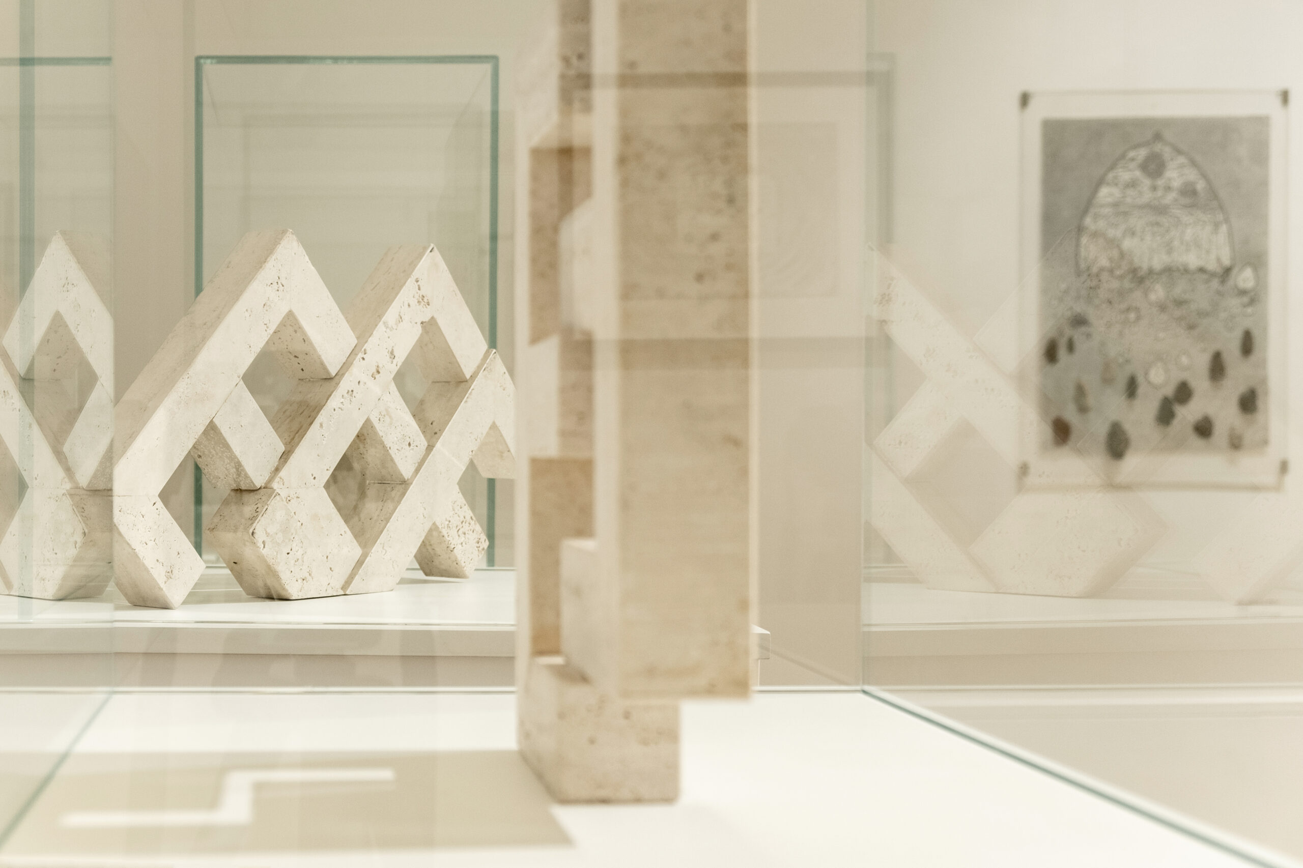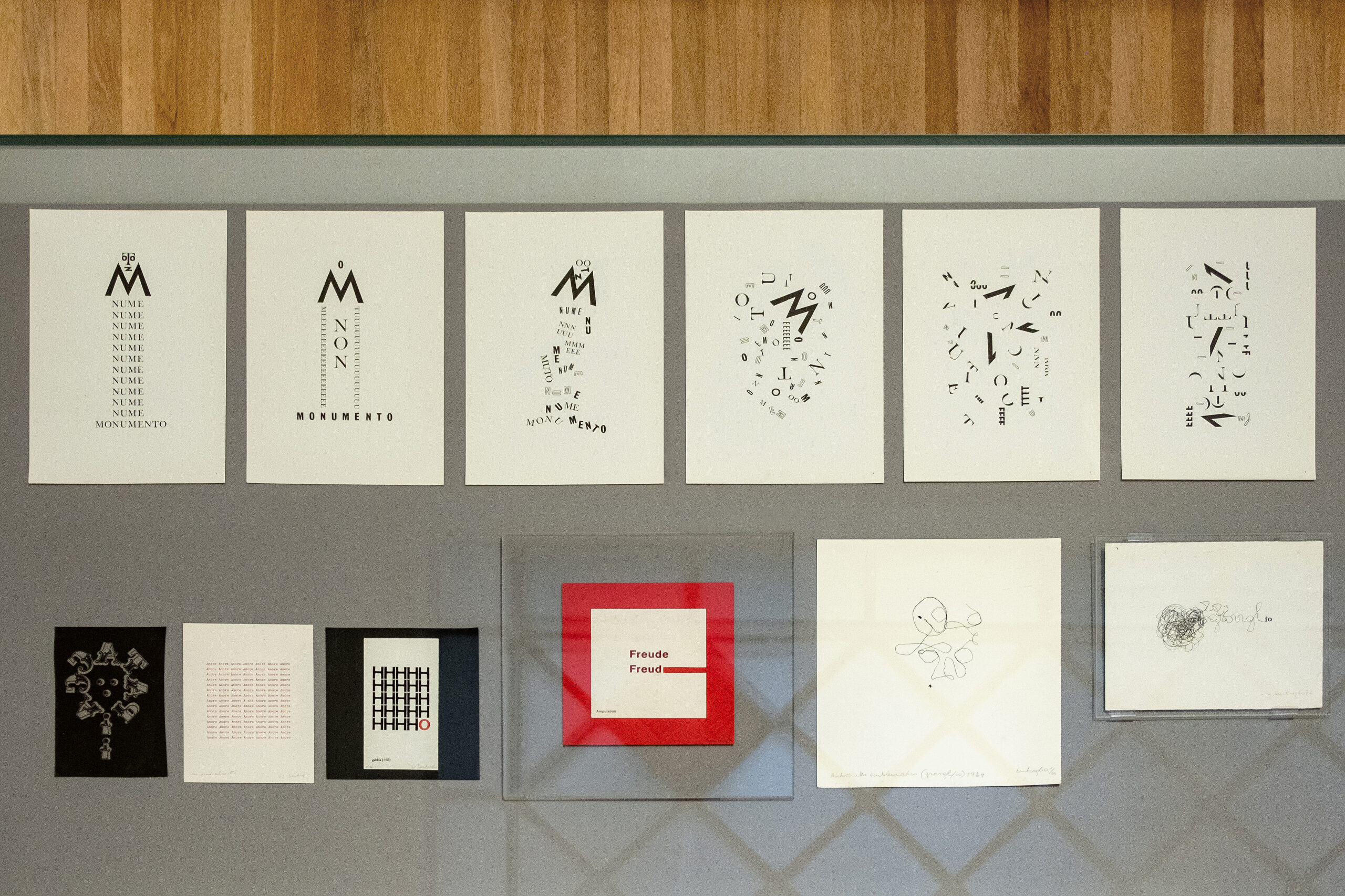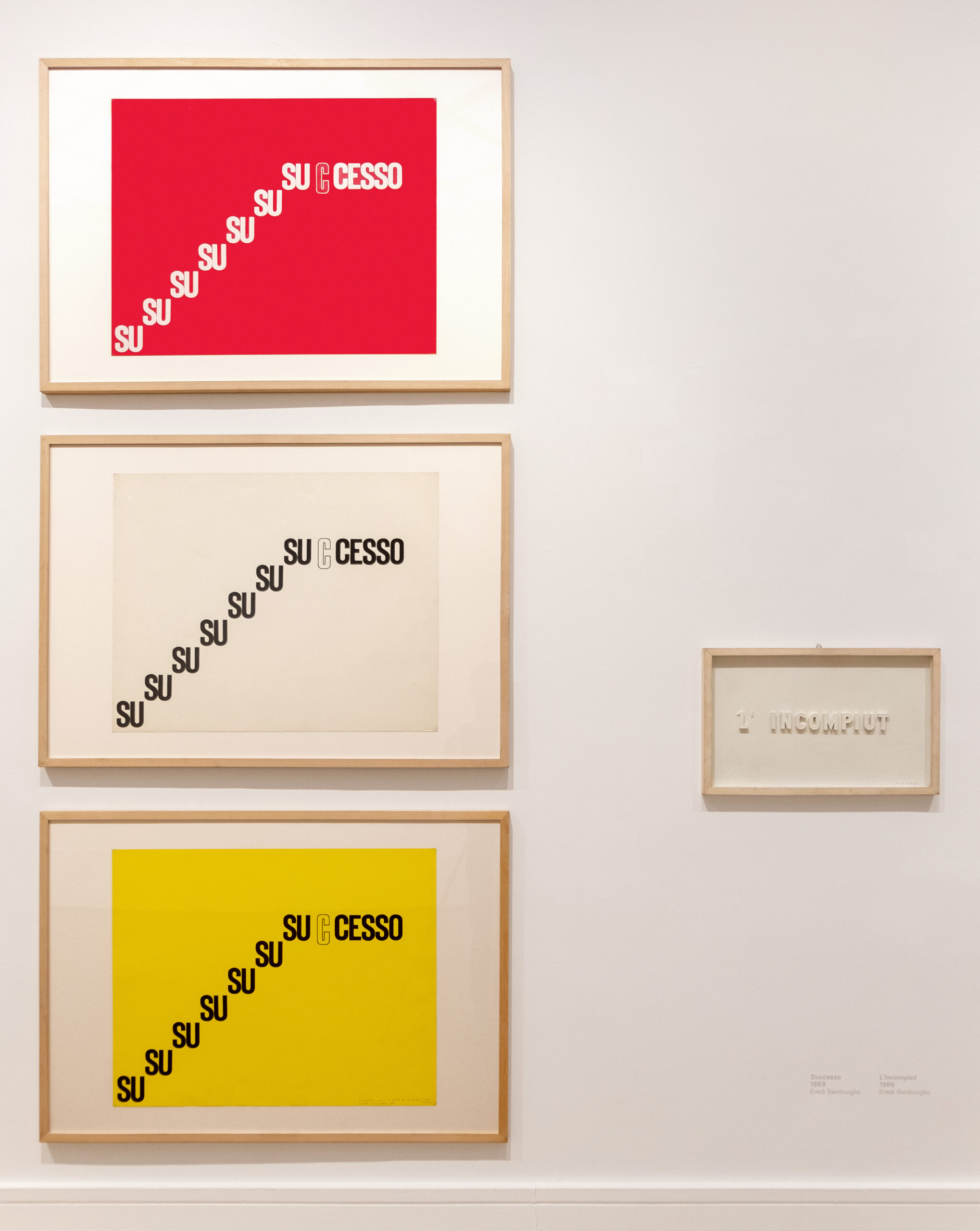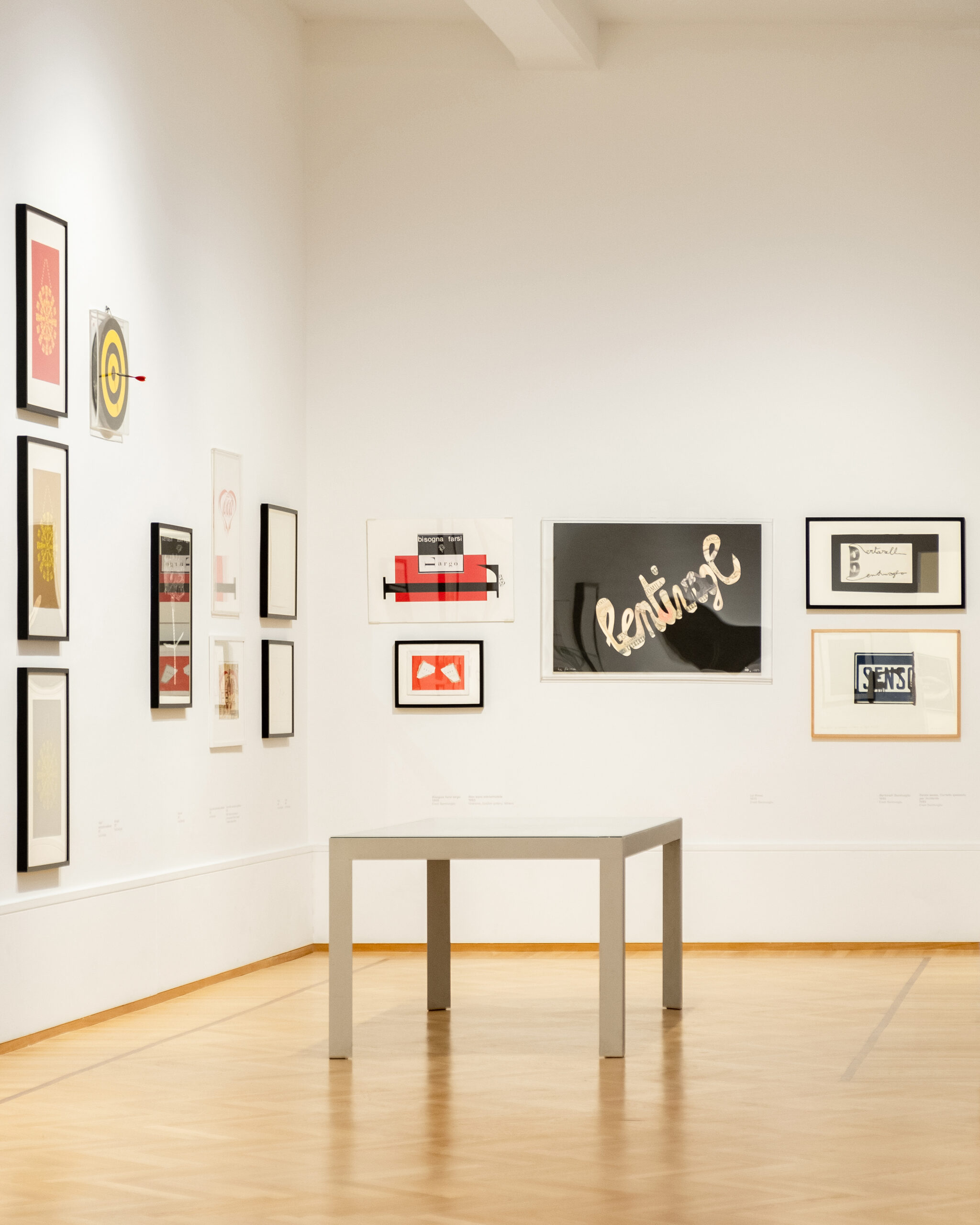 La natura dell’occasione pone le basi di quello che potrà essere un futuro catalogo ragionato pubblicando una cospicua bibliografia dell’artista, redatta da Rosaria Abate, esemplare nel mostrarci quanto sia stato corposo il suo lavoro critico*. L’esigenza di “rompere in continuazione”, oltre allo sforzo di proporre altre possibilità fuori dagli schemi prestabiliti, così insita nel temperamento dell’artista, è stata declinata dalla Galleria Nazionale d’Arte Moderna e Contemporanea in un allestimento inconsueto. Le opere – provenienti per la maggior parte dall’Archivio Bentivoglio – giungono anche da prestigiose istituzioni: oltre ai tre significativi lavori appartenenti alla collezione della Galleria Nazionale stessa, da Venezia, Ca’ Pesaro, dal Mart di Rovereto, possessore della donazione dell’artista, dall’Archivio Tullia Denza, dalla collezione conservata alla Biblioteca Nazionale di Roma, e dalle raccolte di singoli appassionati collezionisti e gallerie (Galleria Gramma_Epsilon, Atene, tra tutte), in un panorama in grado di restituire la complessità dei fenomeni affrontati nella scrittura verbovisuale, nella land art, nelle azioni performative, in un arco temporale che va dagli anni Sessanta fino ai nostri giorni.